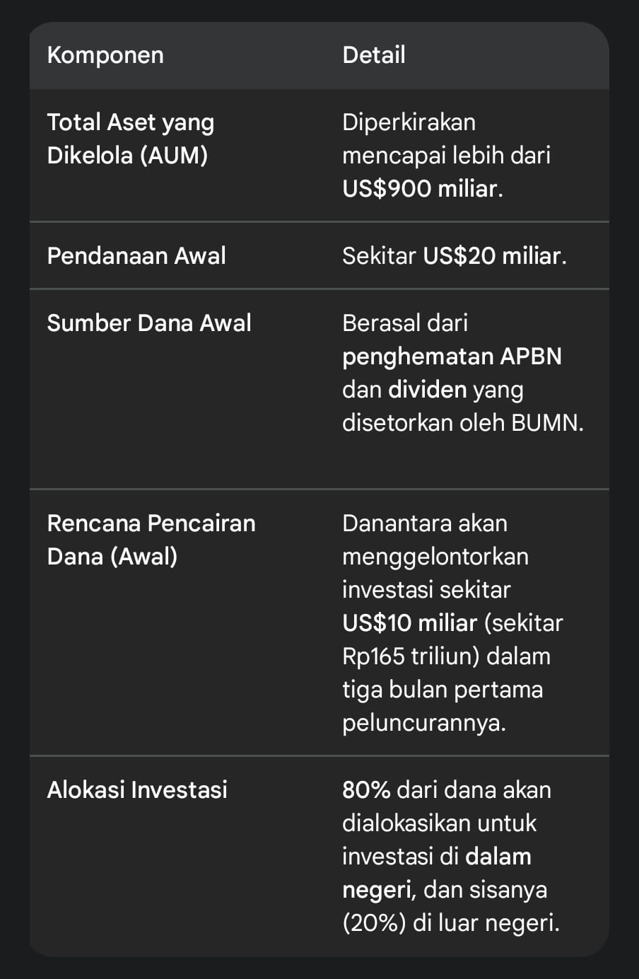 ​Jumlah & Alokasi: Danantara akan mengalokasikan dana sekitar US$10 miliar (setara lebih dari Rp165 triliun) sebagai modal kerja investasi di awal operasinya, dimulai sejak Oktober 2025. Sekitar 80% dana ini ditujukan untuk investasi domestik, termasuk penempatan di pasar saham.