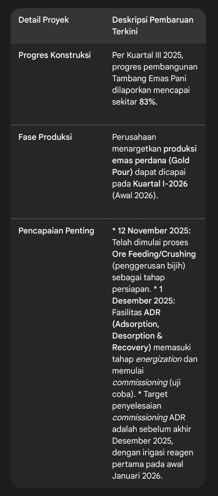 Progress Tepat Waktu: Proyek Pani saat ini sudah mencapai 83% progres konstruksi (per Kuartal III 2025) dan berada di jalur yang tepat untuk mencapai “Gold Pour” (produksi emas pertama) pada awal 2026.