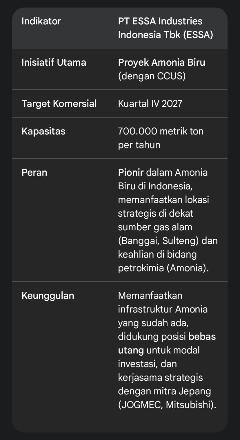ESSA mengumumkan telah mencapai status bebas utang (debt-free) pada Kuartal III 2025. Posisi keuangan tanpa utang ini memberikan fleksibilitas finansial yang besar dan ruang yang lebih luas bagi ESSA untuk melakukan investasi agresif di sektor energi bersih, khususnya proyek Amonia Biru.