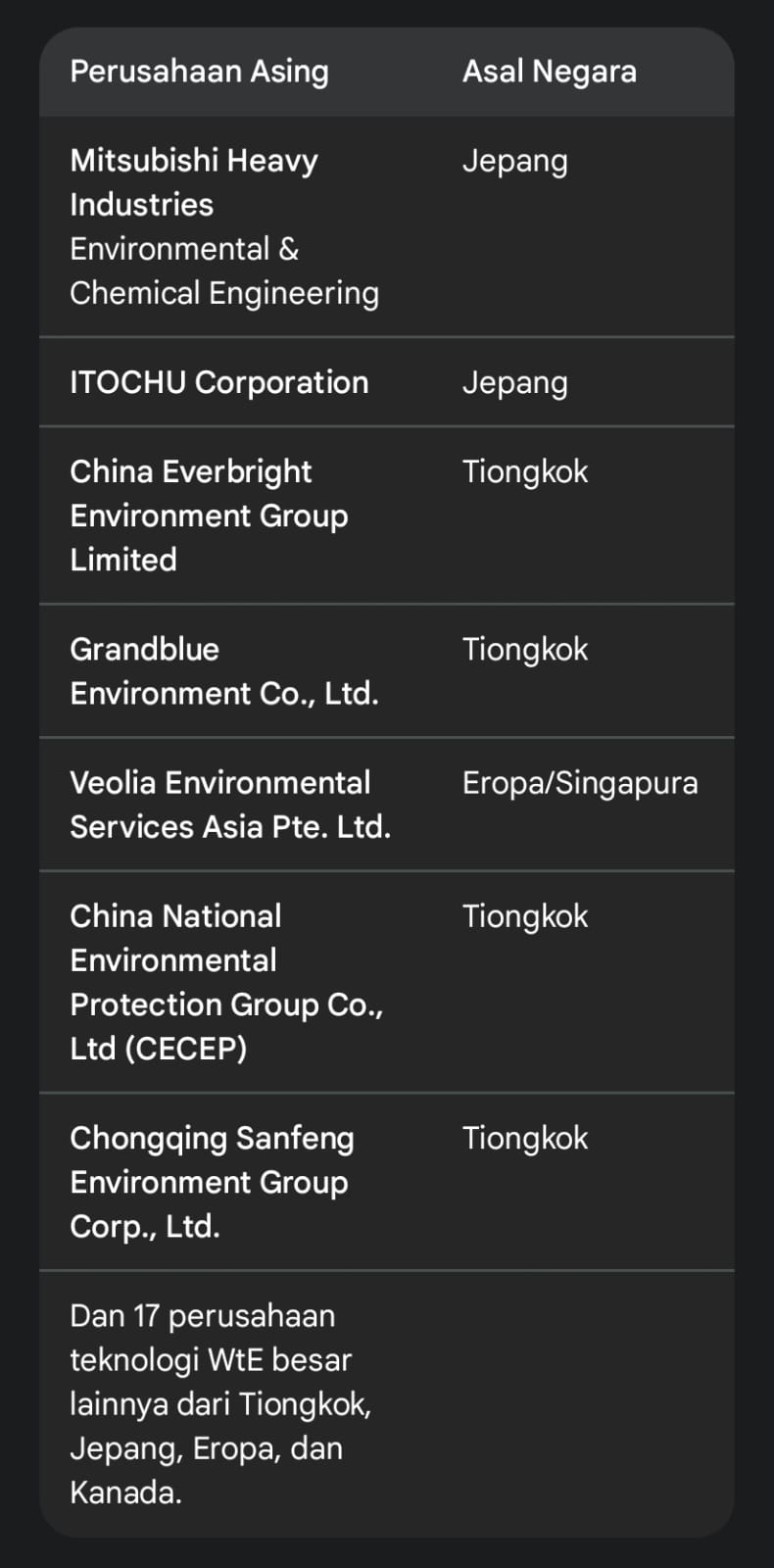 Perusahaan yang mengikuti lelang proyek PLTSa yang diselenggarakan Danantara dapat dikategorikan menjadi dua: Perusahaan Asing yang masuk DPT dan Emiten Lokal yang Bermitra.
