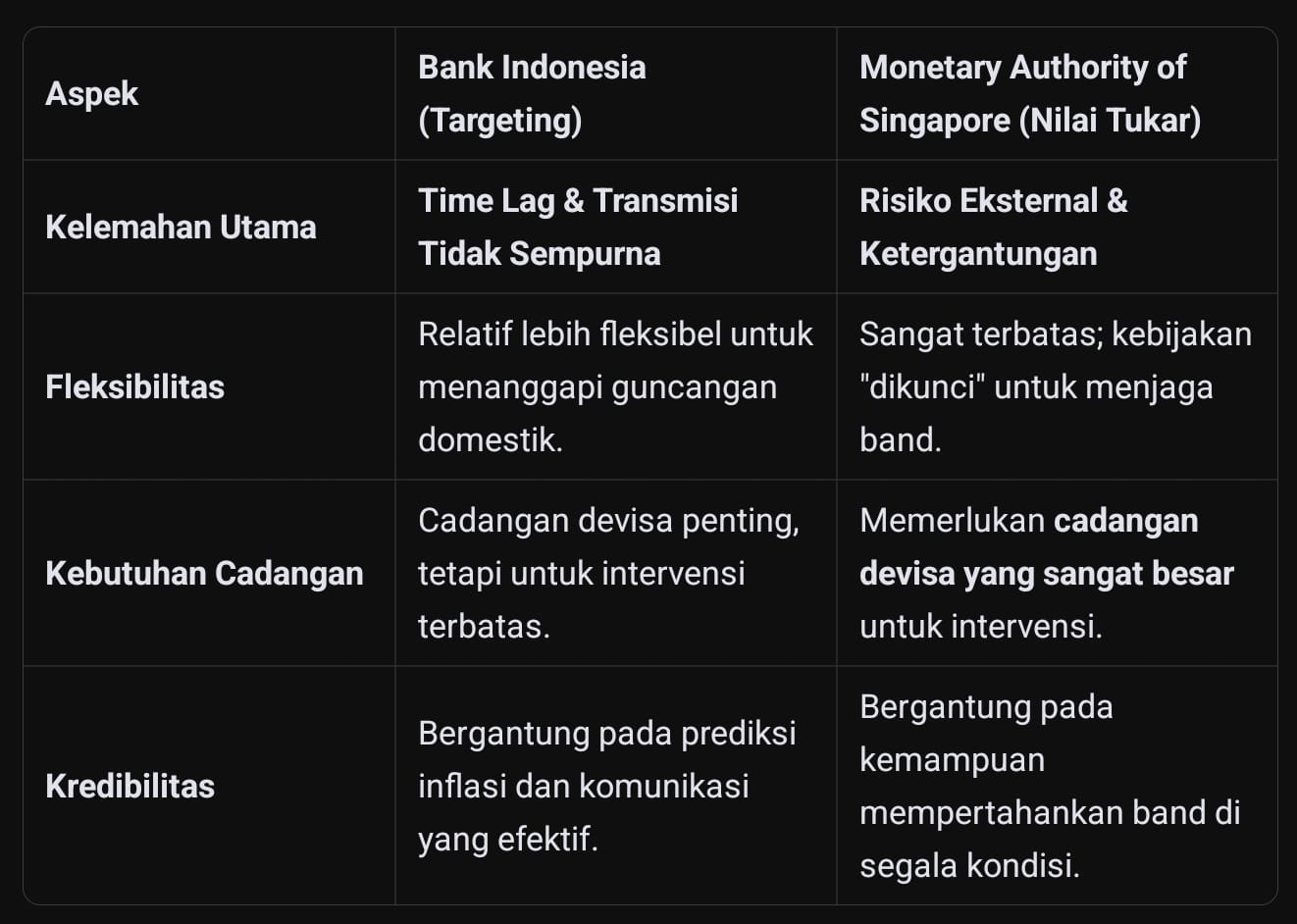 Dengan kata lain, pilihan MAS untuk mengelola nilai tukar adalah strategi yang paling efektif bagi ekonomi Singapura yang kecil, terbuka, dan sangat bergantung pada perdagangan global. Sementara itu, pilihan BI untuk fokus pada suku bunga lebih cocok untuk ekonomi Indonesia yang besar dan lebih berfokus pada pasar domestik, di mana inflasi dipengaruhi oleh banyak faktor, termasuk permintaan dalam negeri.