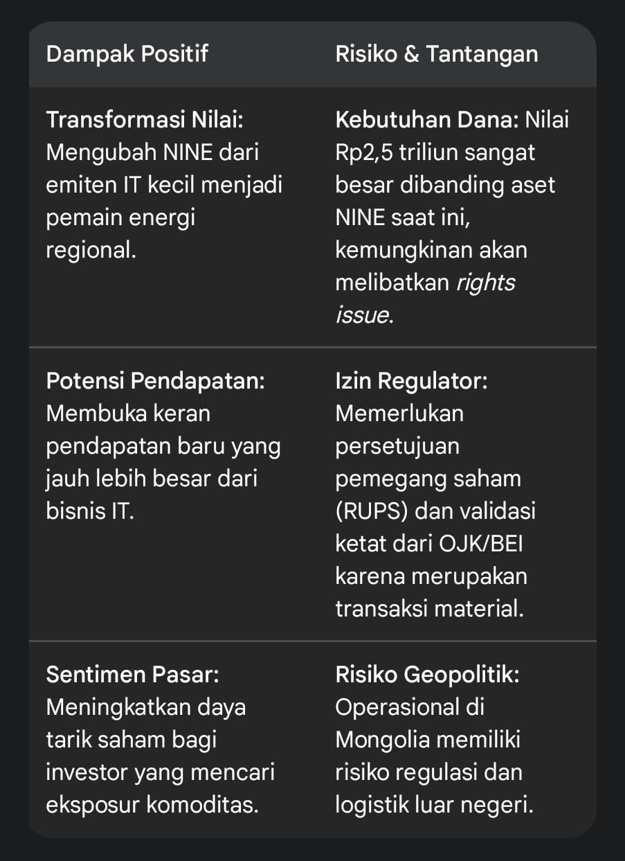 Langkah NINE ini adalah upaya “mengubah kendaraan”. Perusahaan IT yang kecil digunakan oleh Grup Poh sebagai cangkang (shell) untuk membawa aset tambang mereka melantai di bursa (Go Public). Ini adalah strategi cepat bagi perusahaan tambang besar untuk masuk ke pasar modal tanpa melalui proses IPO dari nol.