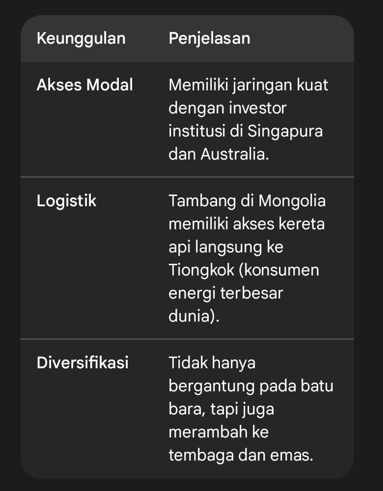 Proyek Nuurst (Batu Bara): Terletak di Provinsi Selenge, Mongolia Utara, sangat dekat dengan jalur kereta api trans-Mongolia yang menghubungkan Rusia dan Tiongkok. Memiliki cadangan batu bara termal (thermal coal) yang sangat besar (estimasi mencapai ratusan juta ton).