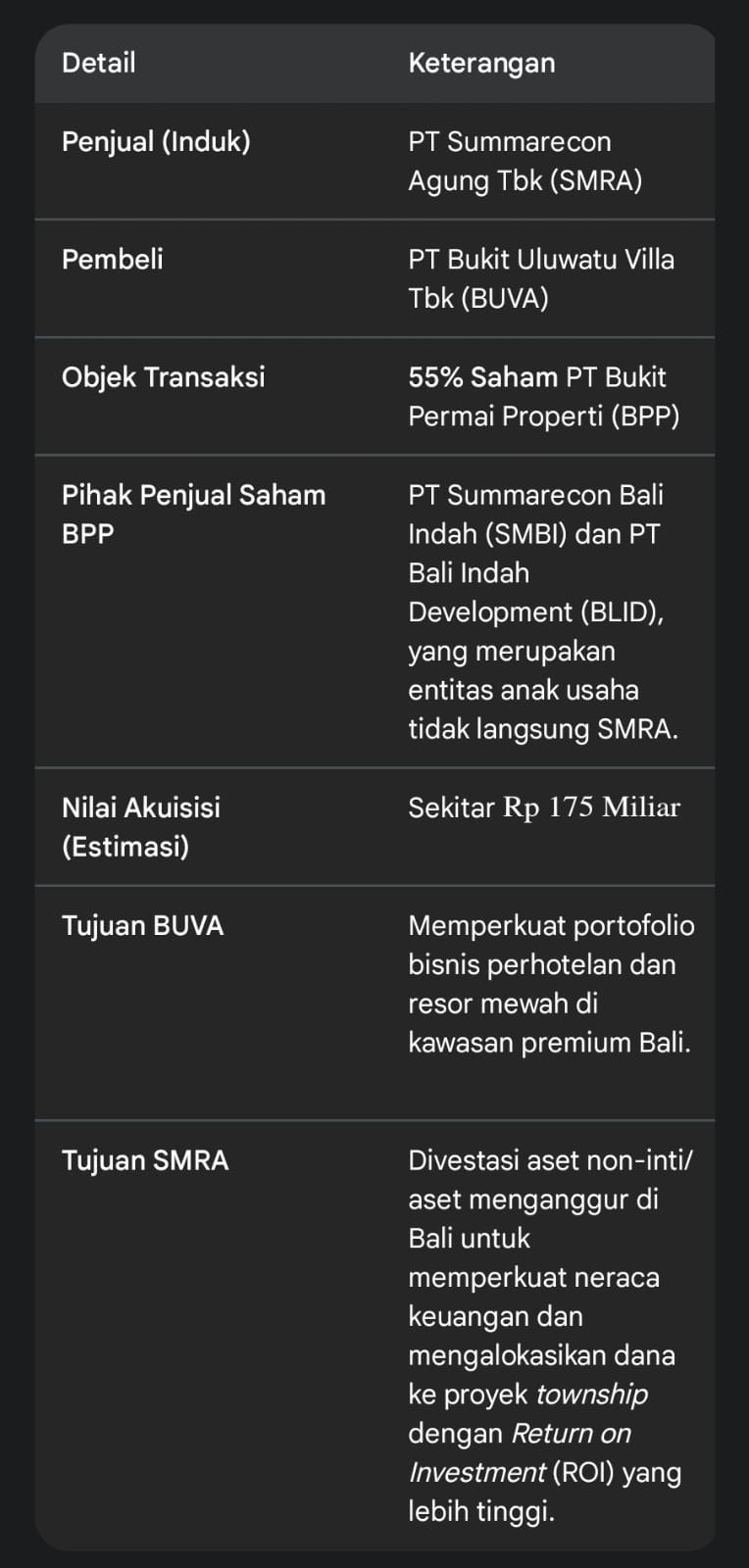 Transaksi yang terjadi bukanlah penjualan lahan secara langsung oleh SMRA kepada BUVA, melainkan melalui akuisisi saham anak perusahaan yang memiliki aset lahan dan properti di Bali.