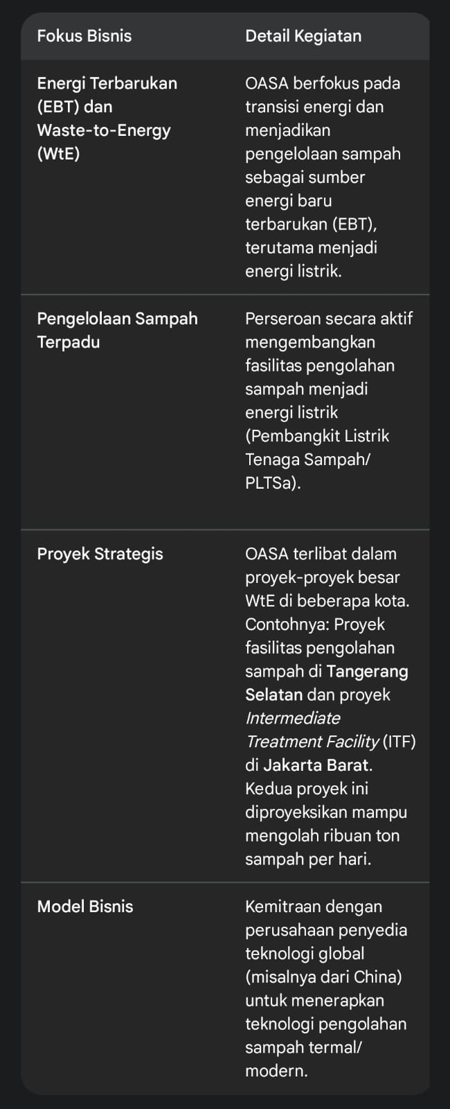Transisi Energi: Dominasi emiten yang melakukan diversifikasi bisnis dari energi fosil (seperti TOBA dan OASA) menuju WtE.