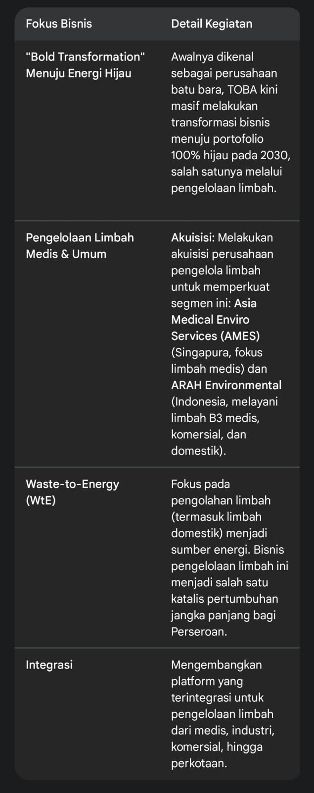 Berikut adalah detail mengenai beberapa emiten utama dalam sektor pengelolaan sampah terpadu di Indonesia: