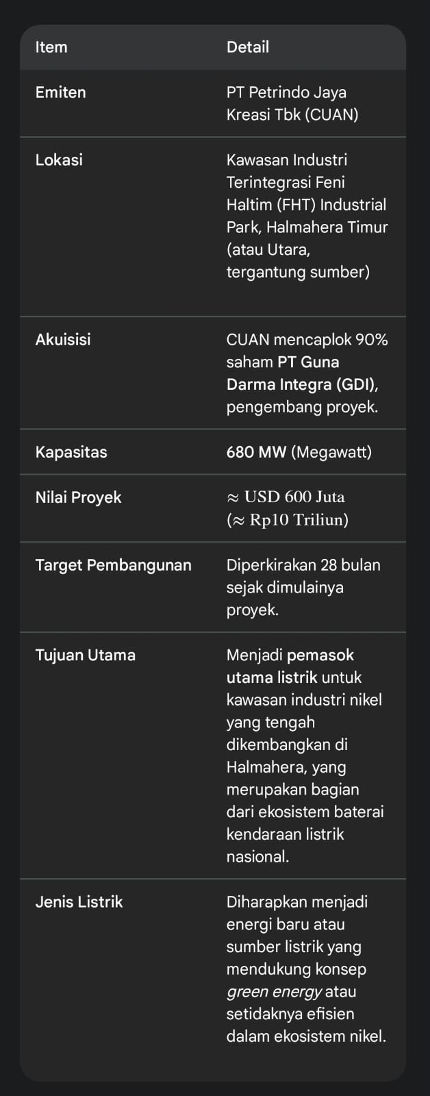 Prospek emiten Petrindo Jaya Kreasi Tbk (CUAN) ketika proyek listrik Halmahera berjalan. Proyek ini merupakan langkah diversifikasi strategis CUAN dari bisnis batu bara ke sektor energi baru dan infrastruktur pendukung hilirisasi mineral.
