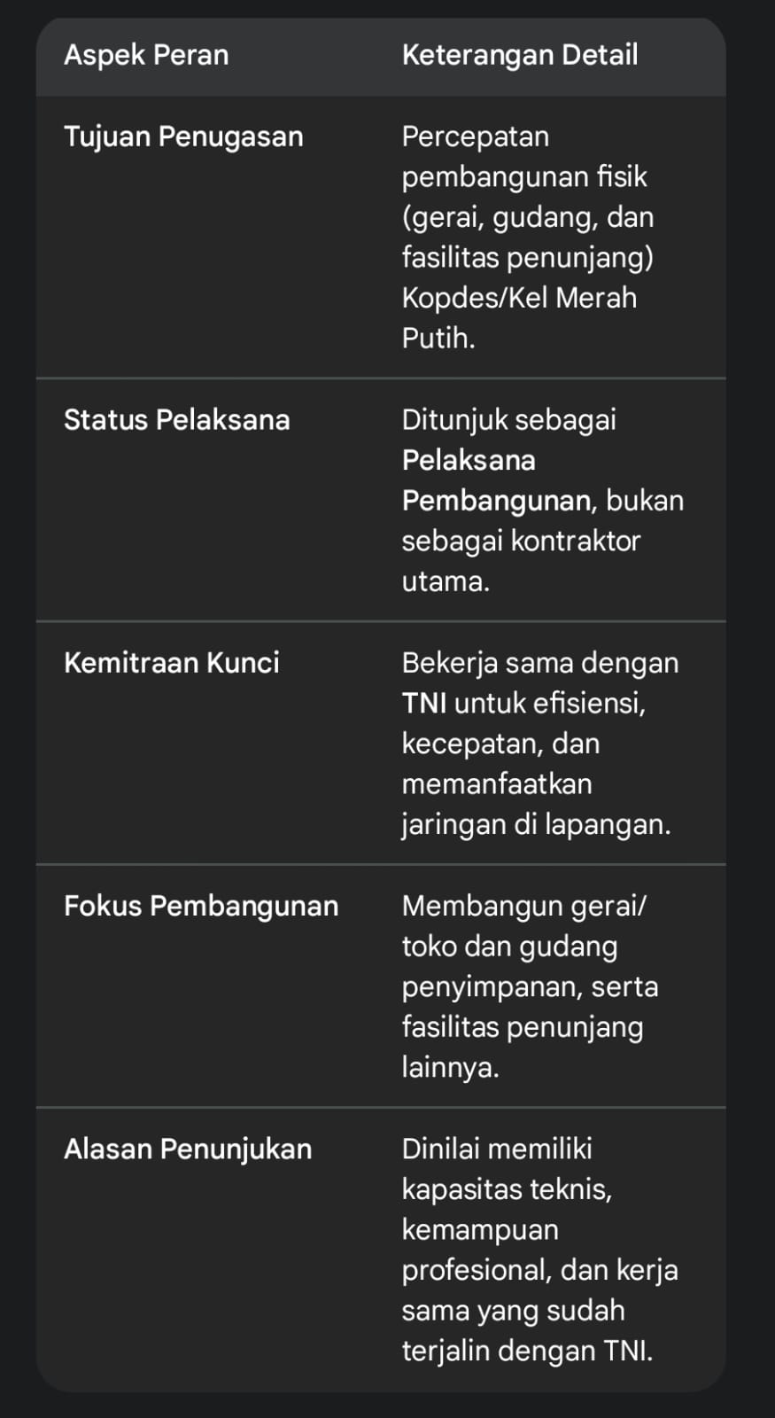 Secara keseluruhan, PT Agrinas Pangan Nusantara bertindak sebagai tangan kanan Pemerintah di lapangan untuk memastikan bahwa infrastruktur fisik (gerai dan gudang) dari 2.400 Koperasi Desa/Kelurahan Merah Putih dapat segera dibangun dan beroperasi.