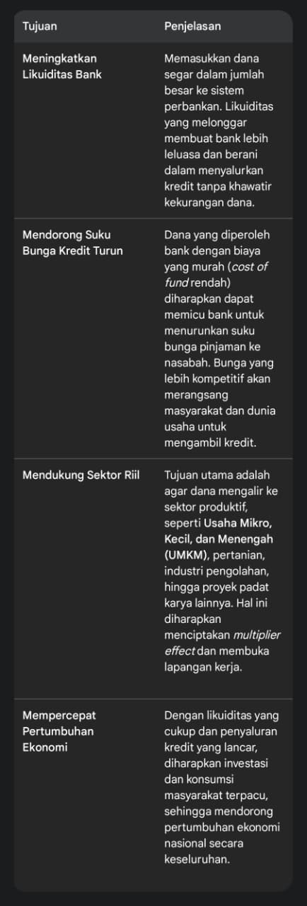 Penyaluran dana Rp 200 triliun ini memiliki tujuan ganda, yaitu mengatasi masalah likuiditas dan menstimulasi ekonomi: