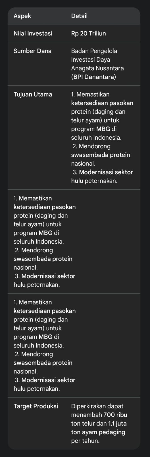 Rencana investasi Badan Pengelola Investasi Daya Anagata Nusantara (Danantara) senilai Rp 20 triliun di sektor peternakan ayam merupakan bagian dari strategi besar pemerintah untuk mencapai swasembada protein nasional dan secara spesifik untuk mendukung program Makan Bergizi Gratis (MBG).