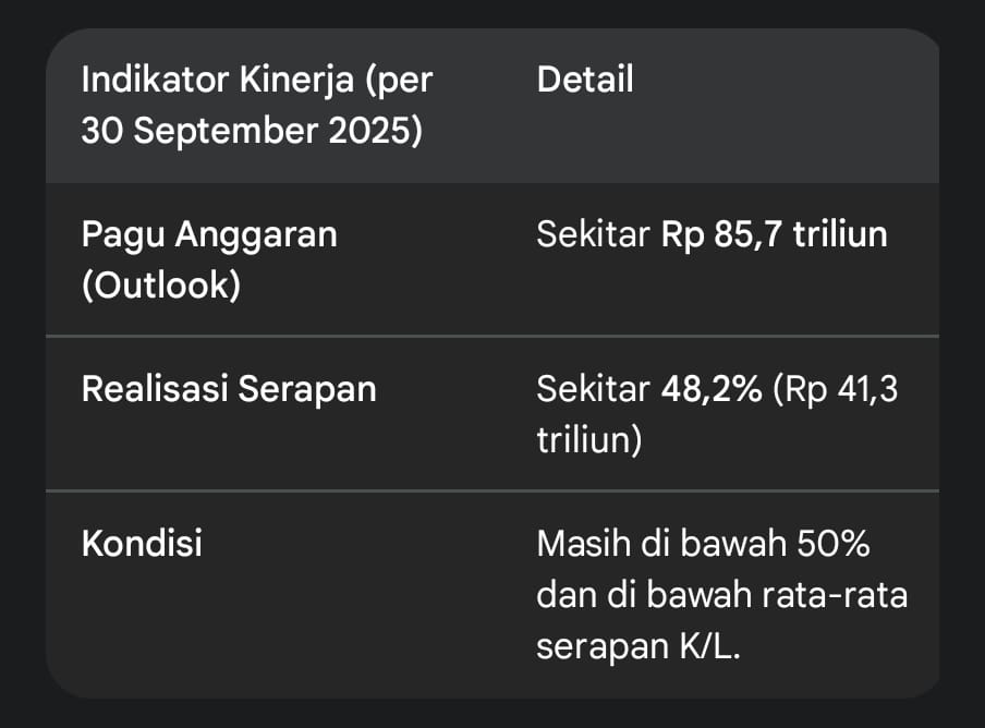Rendahnya serapan anggaran pada Kementerian/Lembaga (K/L) merupakan isu fiskal yang serius, terutama menjelang akhir tahun anggaran. Hingga 30 September 2025 (akhir Q3), tiga lembaga besar yang menjadi sorotan utama karena serapan anggarannya berada di bawah rata-rata nasional (sekitar 62,8%) adalah Badan Gizi Nasional (BGN), Kementerian Pekerjaan Umum (KemenPU), dan Kementerian Pertanian (Kementan).