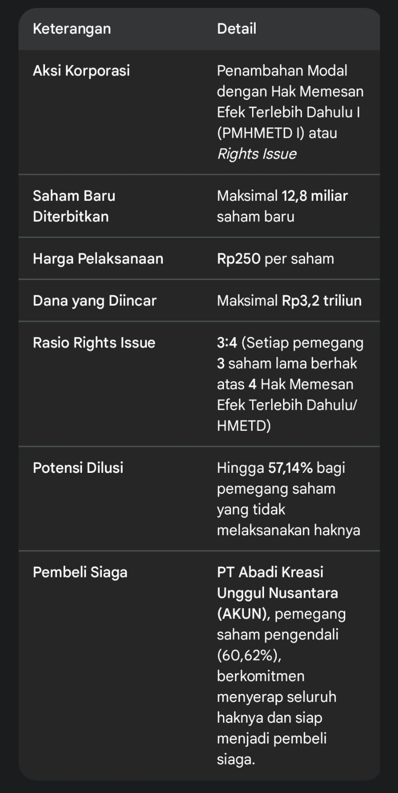Potensi Tambahan Dana: Rp921,6 miliar (jika waran dilaksanakan seluruhnya).