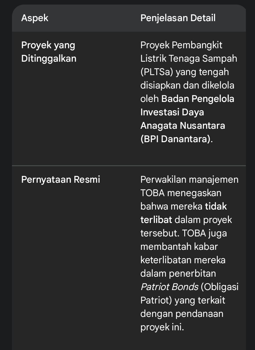 TOBA telah secara resmi memastikan bahwa mereka tidak terlibat dalam proyek Pembangkit Listrik Tenaga Sampah (PLTSa) yang dikelola oleh BPI Danantara, meskipun sebelumnya TOBA digadang-gadang sebagai salah satu kandidat kuat.