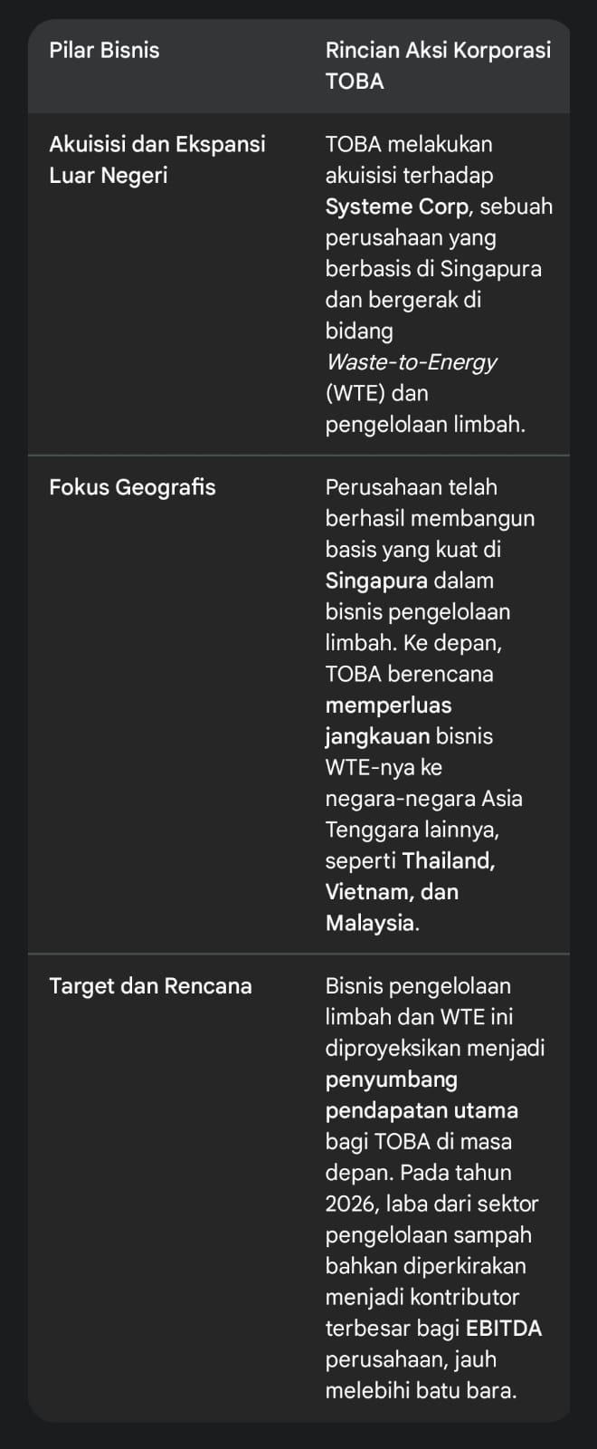 TOBA memilih untuk mengeksekusi visi Waste-to-Energy-nya melalui ekspansi regional dan fokus pada pasar yang dinilai memiliki keekonomian lebih menarik, sambil tetap memprioritaskan pilar energi terbarukan lainnya di Indonesia.