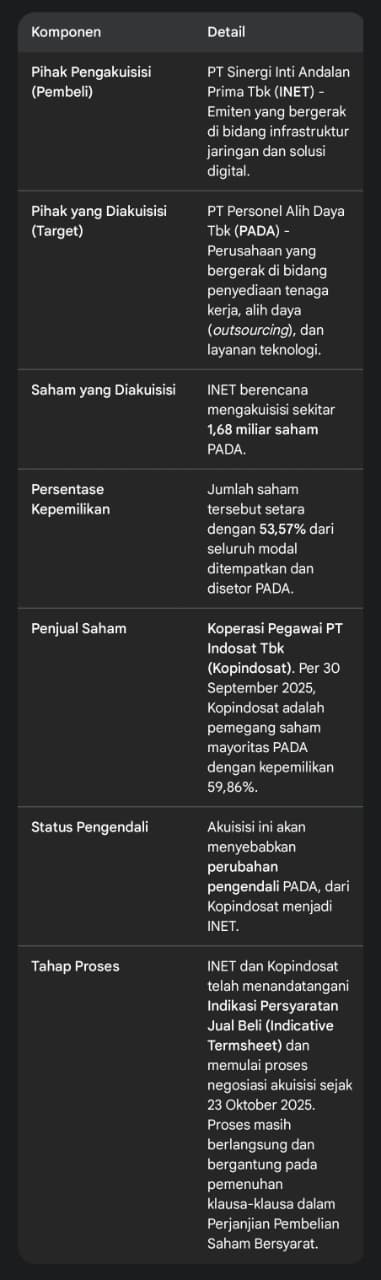 Adanya rencana PT Sinergi Inti Andalan Prima Tbk (INET) untuk mengakuisisi saham PT Personel Alih Daya Tbk (PADA). Rencana ini merupakan langkah strategis besar bagi INET untuk memperluas ekosistem bisnis digitalnya ke sektor layanan sumber daya manusia (SDM) berbasis teknologi.