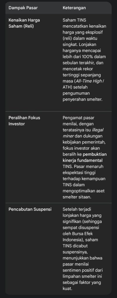 Limpahan aset dan penertiban tambang ilegal oleh pemerintah telah memicu sentimen yang sangat positif di pasar modal, menjadikan isu ini sebagai katalis utama kenaikan harga saham TINS.