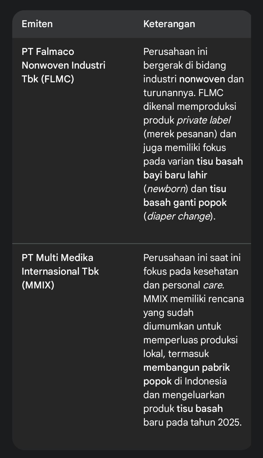 Emiten atau perusahaan terbuka yang terdaftar di Bursa Efek Indonesia (BEI) yang secara langsung berkaitan dengan produksi dan penjualan popok bayi dan/atau tisu basah: